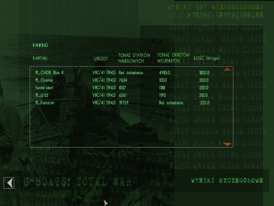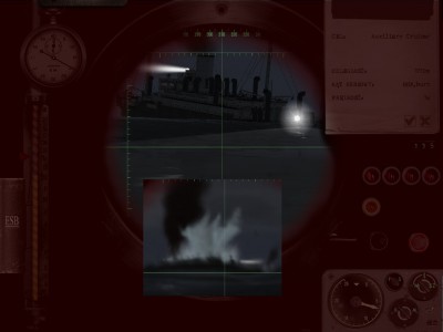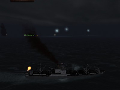 Szwed akurat był na kursie torpedy rufowej, szybko dane zebrałem i posłałem celną torpedę, niestety nie tonie. Rozpocząłem pościg. Na peryskopowej wycisnąłem z silników elektrycznych ile się dało, byłem o około 2 węzły szybszy. Na 5 minut przed końcem patrolu zatrzymałem się, zebrałem dane, posłałem torpedę i zatopiłem na 3 minuty przed końcem .