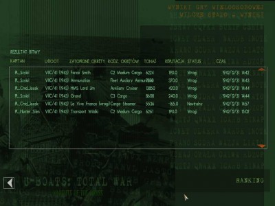 Po baaardzo długiej przerwie (prawie 2 lata) postanowiłem znowu popływać jakieś patrole, bo, czemu by nie . Zaczęło się od małych kłopotów z połączeniem, ale udało się w końcu zacząć grę. Zacząłem pod wodą, szybkie oblecenie otoczenia mikrofonem i już wiedziałem, gdzie się udać. Po lekko ponad półgodzinnym podejściu, zauważyłem dymy. Okazało się, że to C2 i C3 płynące prosto na mnie, żadnej eskorty, lepiej być nie mogło . Ustawiłem się pomiędzy nie, wyciągam peryskop, patrze się, a tu niespodzianka, przedemną ok. 800 m. Amunicyjniak, no to zbieramy dane i posyłam dwie rybki. Gdy druga poszła, nagle przed peryskop nadpływa mi C2, dostaje jedną i... jakież wielkie moje zdziwienie, wybucha i pokornie schodzi na dno . Ale piękne, pierwsze zatopienie po tak długiej przerwie, wybornie . Biorę na cel C3 za mną, zbieram dane, strzelam, trafiam, wybucha i schodzi, tak jak C2. Wtedy usłyszałem kolejny wybuch, Amunicyjniak dostał i dokładnie to samo, wybuch i dno. Ucieszony 3 zatopieniami i brakiem eskorty w okolicy popędziłem w stronę kolejnego kontaktu, po drodze zauważając 2 DD polujące na kogoś przy górze lodowej. Znajduję C2, które okazuje się crazy finkiem, a że nie widząc innych handlowych celów w okolicy, zbieram namiary i wale wszystkim co mam, czyli 4 rybki z 2,5 km. Niestety, nie trafiłem, ale trudno. Potem postanowiłem się zanurzyć na 50 m i odpływać jak najdalej. Po 1,5h Hunter Silent wychodzi na peryskopową, a że jest w miarę bezpieczny, wychodzi na obserwatora, sprawdza moje bezpieczeństwo, to samo, tak więc i ja wychodzę. Jedyne, co zdążyłem zobaczyć, to uciekającego Crazy Finka, Jacka i okładające niemiłosiernie 2 DD zniszczony u-boot Kanarona. Skończyliśmy przed czasem, ponieważ Jacek już był w pełni bezpieczny.