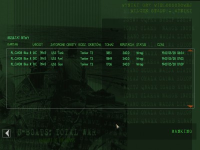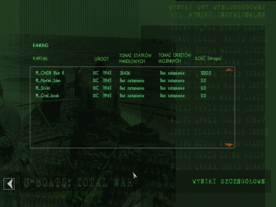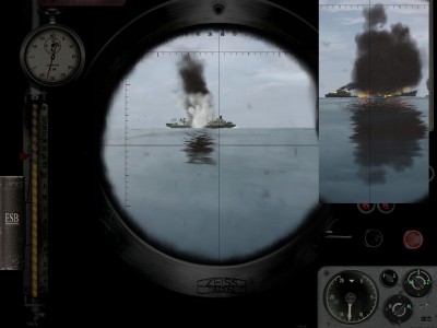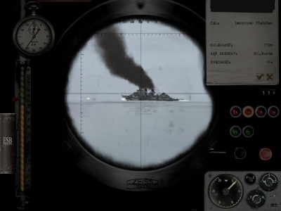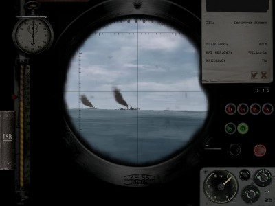 Ja spokojnie, zaczynam na powierzchni, prędkość pół naprzód, peryskopowa. Ogarniam hydrofon, konwój na lewo ode mnie, zmieniam kurs, płynę na konwój i wynurzenie. Chwilę po wynurzeniu (może 5 minut od rozpoczęcia gry) słyszę "Zauważono samolot!" Tak więc szybkie zanurzenie, samolot zaczyna ostrzał, zrzuca bombę, którą nie trafił dzięki Bogu. Podchodzę na pół naprzód na peryskopowej, gdy słyszę od hydroakustyka "Niszczyciel, odległość średnia, zbliża się!" Wyciągam peryskop i faktycznie, dd może 2 km ode mnie. Szybka ucieczka w głębiny i wymijanie pierwszej serii bomb. 200 metrów, cisza na okręcie, najmniejsza prędkość. Udaje mi się uniknąć bez żadnych uszkodzeń 2 serie bomb, gdy dd-ki dały sobie spokój, tak więc 3 węzły, wynurzenie na peryskopową z 200 metrów.