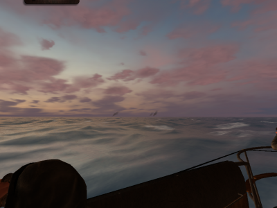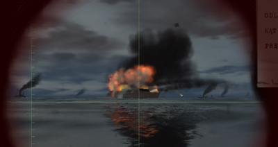 No a teraz o mnie: początek misji i pierwsza myśl: czy ja taką pogodę dałem?? Ehh widać się pomyliłem, założenie było takie aby powystrzelać kutry z działa. No ale płynę dalej. Na horyzoncie widzę grupę uderzeniową. Chciałem zatopić pancernik, ale stwierdziłem, że lepiej nie ujawniać się przedwcześnie i mu odpuściłem, po kilku minutach wyleciał w powietrze.