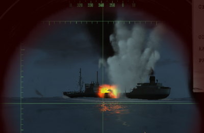 Posłałem dwie rybki do Medium Cargo, trafiła jedna i wyleciał w powietrze Szykuję następne dwie na Tanker Empire Celt, zbieram dane, rybki poszły i około 3 sekundy po wystrzeleniu torped ktoś mi go zatopił. 2 rybki w plecy.