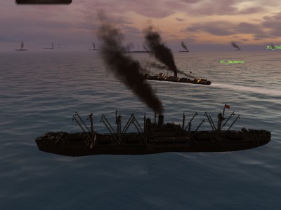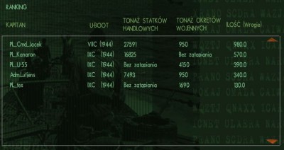 Patrol dość ciekawy. Widzę lotniskowiec, ale postanowiłem go odpuścić. Wpływam do konwoju, za mną bardzo blisko (około 250 metrów) przepłynął dd-ek, ale nie wykrył. Ustawiam się przodem do Arrow Tankera, posłałem magnetyka pod kil i kontaktową. Uszkodziłem ale nie tonie, w między czasie 370 metrów ode mnie na rufę ładnie się Large Cargo ustawił, magnetyk poszedł i został unieruchomiony. Posłałem kolejną kontaktową do Arrowa i zatonął. Przed dziobem ładnie mi Tanker Empire Celt przepłynął, posłałem magnetyka pod kil, trochę się zanurzył, ale nie tonie, poprawiłem kontaktową. Rufowa mi się przeładowała, obok mnie spadły bomby i handlowiec mnie ostrzelał, ale nic się nie stało, ale na mnie zaczęły dd-eki płynąć, do najbliższego posłałem akustyka, a do Large Cargo kontaktową i natychmiast zanurzenie. Słyszałem, że obie rybki trafiły, ale Large Cargo do końca nie zatonął, a dd-ek też nic sobie z akustyka nie robił, sprawdzałem dokładnie: żaden niszczyciel nie stracił śruby, nie miał przechyłu, tak jakby akustyk się rozpłynął zaraz po trafieniu...