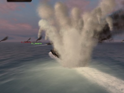 Pływam na 230 metrach, czasami są pingi, bomby wybuchają ale gdzieś daleko, jestem na 100% pewien, że im zwieję i jeszcze dobiję Large Cargo, a miałem jeszcze 6 rybek. Nagle ciche pingi, bomby wybuchają, ale nadal daleko. Usłyszałem bomby w wodzie, ktoś na obserwatorze mówił, że te bomby pojawiły się znikąd, dd-ek ich nie zrzucił (zresztą słyszałem dd-eki za sobą), a samolotu nie widział, widać jakiś samolot-duch je zrzucił z niezłą precyzją, bo na 230 metrach te bomby zrobiły mi tak: