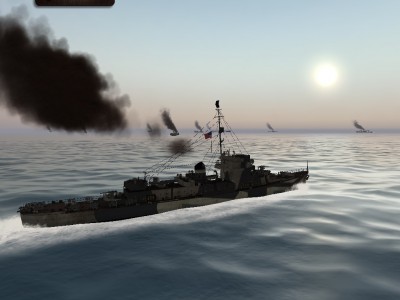 Z początku płynę ostrożnie, bo już po wyjściu na peryskopową widziałem dymy. W 5 minucie gry bardzo się zdziwiłem, bo zorientowałem się, że niszczyciel płynie prosto na mnie, jak mnie wykrył? Nie wiem, ale zalałem dziobową torpedę i czekam aż podpłynie, niestety zaczął zygzakować. Musiałem obrócić się, miałem go na namiarze 60 i posłałem akustyka, niestety był już tak blisko, że musiałem uciekać w głębię, czyli... na 50 metrów... Oberwałem jeżami, ale żyłem, zdążył tylko kilka bomb zrzucić, na szczęście niecelnych i dostał akustykiem. Wychodzę na peryskopową, żeby zdjęcia zrobić jak tonie i ku mojemu zdziwieniu zobaczyłem tylko jak płynie sobie dalej, nie ma najmniejszego przechyłu, lekko płonie, potem widziałem, że mu tylko jedna śruba odpadła... (3 patrol w ostatnim czasie gdy mój akustyk nic nie robi...). Taki płynący niszczyciel, pomimo że nie zaatakuje to jednak niestety może pingować i miałem na głowie kolejnego, a akustyka brak. Posłałem w nadziei salwę, ale nie trafiły. Jeże mnie poważnie uszkodziły, a bomby dobiły.