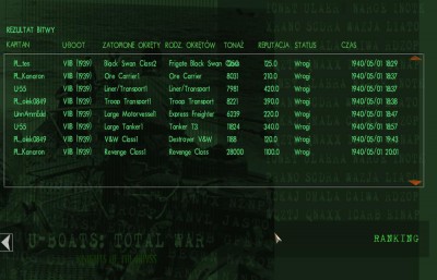 Mnie niestety zabrakło szczęścia w tym patrolu. Konwój był idealny, by spokojnie zatapiać. Pozycje miałem prawie idealną. Pierwszym celem był bodajże Fast Freighter (ok. 12000BRT). Zbieram spokojnie dane, następnie odpalam salwę dwóch torped. Trafiły idealnie w rufę i dziób pod kilem. No ale on płynie dalej. Szybko by mi nie uciekł posłałem jeszcze jedną rybkę która wybuchła w okolicach dzioba pod kilem. Chyba nawet tego nie zauważył bo płynął dalej szczęśliwy, w dodatku przyspieszając a ja zmarnowałem trzy torpedy, szkoda mi było czwartej. No trudno. Następnie płynął przede mną jakiś frachtowiec (6000BRT). Posłałem rybkę, wybuchła idealnie pod kominem. Zatrzymał się, więc z rufowej posłałem kontaktówkę w dziób. Nie chce tonąć. Czekam na torpedy do przeładowania, po czym ślę magnetyczną pod kil. Nie wziąłem jednak pod uwage, że nabrał już wody i jest nieco niżej. Torpeda zmarnowana. No trudno, muszę czekać 10 min by go dobić. Ostatnia kontaktówka na szczęście dokończyła dzieło. Tymczasem wszystkie fajne cele mi uciekły. Ustawiałem się na pozycje, by rufową strzelić w jakiś mały statek (chyba 4000BRT), tymczasem słyszę już pingi. Ale chciałem przynajmniej wystrzelić tą jedną przed zanurzeniem. Strzeliłem (chyba nawet nie trafiając) po czym zanurzenie na 140m. Po 5 minutach chciałem sprawdzić na peryskopowej czy sytuacja się uspokoiła. No ale, że znowu pingujo, to znów zanurzenie 150m. Płynę tak 10 minut, po czym znów się wynurzam tym razem powoli. Jestem już tak na 80 metrach, po czym słyszę bombki w okół mnie. Cały okręt czerwony, wszyscy zginęli no i KIA. Bez pingowania, prawdopodobnie Ddek zrzucał bomby na ślepo, bo nie mógł mnie usłyszeć.