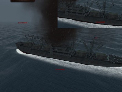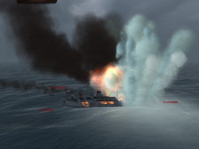 Przez pierwsze 15 minut płynę 3 węzły. Potem cały czas 1 węzeł. Co jakiś czas wystawiam peryskop. Nagle w peryskopie widzę dwa niszczyciele, nawet blisko. I kogoś obrzucają... No to znowu po mnie :| Chwilkę później Finek zgłasza KIA, minutę później Olek też KIA, potem wynikło, że Olek płynął z maksymalną prędkością przez jakiś czas... Sprowadził dwa DD-eki, jeden zrobił kółko i trafił na Finka. Konwój płynął na mnie (myślałem, że równolegle przez jeden handlowiec, który się chyba musiał zapętlić, albo robił zwrot).