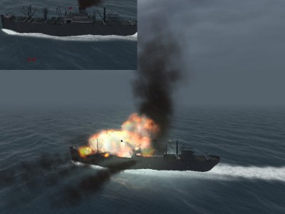 W końcu pojawia się tankowiec, przepuszczam go i atakują dwiema torpedami Liberciaka. Obie trafiają i .. statek odpływa.