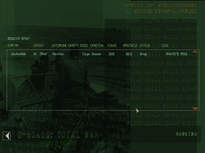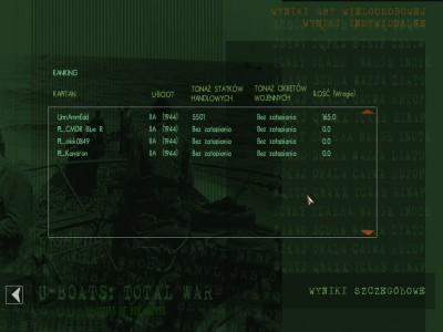 Patrol odbyty na kaczuchach. Po podaniu pozycji konwoju przez Kanarona, okazało się, że jest ok. 30km od niego. Niestety kaczuchy płyną max 13w, więc dopiero po półtorej godziny dostrzegłem dymy. 5 minut przed końcem miałem wreszcie okazje strzelić torpedami. Do Cargo Streamera puściłem magnetyka pod kil. Po udanym trafieniu strzeliłem drugi raz, okazało się, że niepotrzebnie, bo po pierwszej rybce nabrał wody i zatonął. Ostatnią torpedę strzeliłem szybko do ruskiego pancernika (ok. 9000BRT) i trafiłem w rufę. A potem patrol się skończył.
