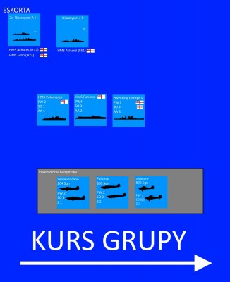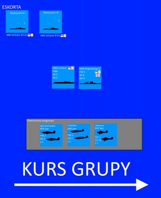 Idziemy pełną parą na NNE. Samoloty w powietrzu mają szukać wroga. Myśliwce mają osłaniać TF99.