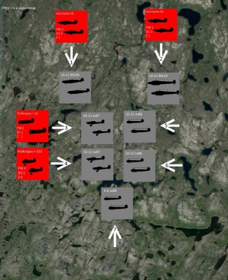 [możesz dołączyć samoloty z lotniska do ataku. Białe strzałki to możliwości ataku (myśliwce nie blokują dołączania do walki, bo są "związane" Hurricane'ami, które wyleciały im naprzeciw)]