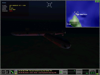 W takiej sytuacji jedyne co pozostawało to spowodować aby niebiescy nie mogli osiągnąć swojego celu. Kierując się na południe liczyłem na zidentyfikowanie i zniszczenie jednostek desantowych przeciwnika. Ponieważ okręt dotkliwie ucierpiał w wyniku trafień jedynym uzbrojeniem zdolnym do działania była lewoburtowa wyrzutnia torped. W międzyczasie ujawnił się też na podejściu do strefy lądowania drugi okręt podwodny typu Los Angeles, który wystrzelił salwę rakiet w kierunku północym. Po zlokalizowaniu odpaliłem 2 topredy UGST w kierunku pozycji LA oraz jednostki zidentyfikowanej jako element sił desantowych. Jedna z torped minęła blisko Los Angeles obierając za cel okręt desantowy typu NEWPORT - jednostka została ciężko uszkodzona, zmniejszyła prędkość ale pozostała na kursie do rejonu lądowania. W rejon wejścia do cieśnymy wysłałem śmigłowiec (który zapewniał mi obraz radarowy), prubując jednocześnie atakować okręt podwodny (bez efektu). Mimo protestów oficerów politycznych mając 90% zniszczeń postanowiłem wycofać się w kierunku wschodnim wychodząc na spotkanie przestarzałej sojuszniczej fregacie typu NAJIN (który szedł w stronę strefy lądowania na przechwycenie uszkodzonego NEWPORT'a).