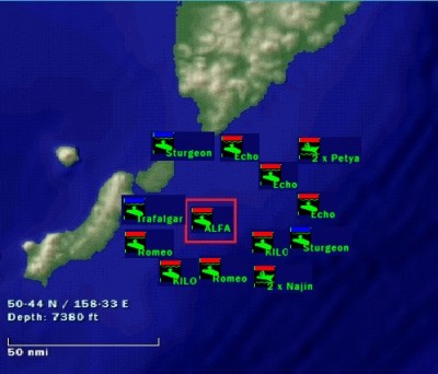 Zadaniem strony RED jest ochrona wszystkich 3 okretow podwodnych typu ECHO oraz niedopuszczenie do ich zatopienia, daleką osłonę zespołu stanowią 2 fregaty typu PETYA.
