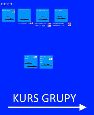-szyk: HMS Manchester z komandorem na pokładzie płynie w centrum zespołu. Jednostki transportowe mają utrzymywać za nim bezpieczna odległość (do kilometra) W skład zespołu wchodzą też obydwa niszczyciele Hunt które szyk otwierają i zamykają. Całą reszta eskorty ustawia się promieniście wokół zespołu w odległości ok 2,5KM od HMS Manchester
