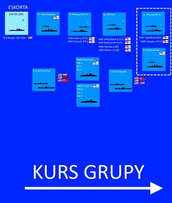 Wyznaczam za dowódcę kapitana niszczyciela HMS Hursley, który będzie prowadził konwój PQ, organizacja - taka jak w pierwotnym założeniu (jak płnąłem z pierwszym konwojem, dostasowana rzecz jasna do ilości frachtów) CAM płynie z tyłu