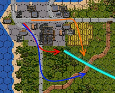 Najpierw czołgi z plutonu C ustawiaja sie na wybranych pozycjach. W tym czasie na miasto idzie krótki ostrzał artyleryjski a pluton B i Panzergrenadierzy dochodzą tu (pokazał na mapie).