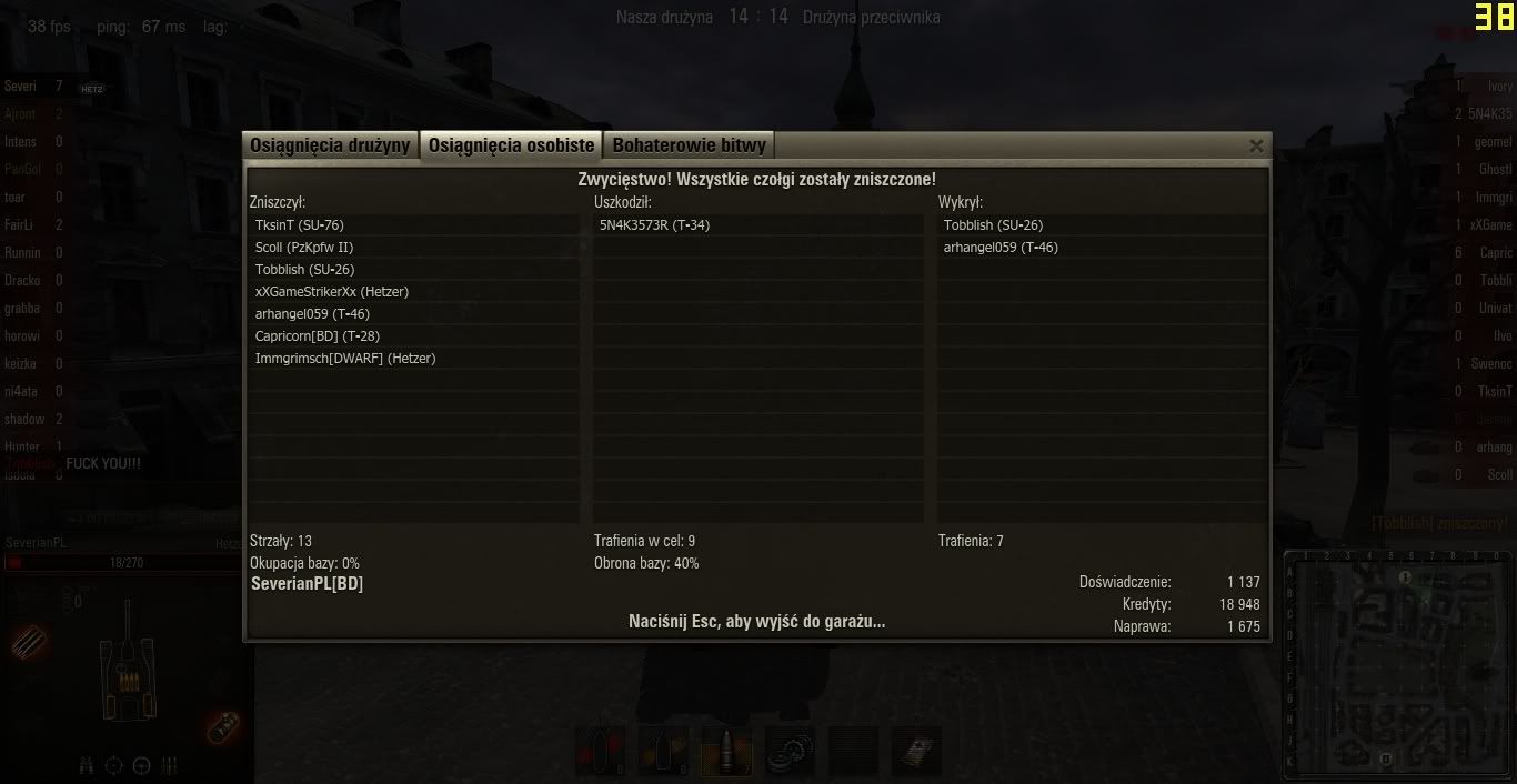 Na PzIII miałem ostatnio wygraną bitwę, uszkodzony jeden czołg, zniszczony jeden i wykryte dwa i...160 pkt.... Sprawdzają moją cierpliwość czy jak ![]() |