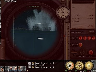 Zostałem wykryty podczas podejścia, ale wcześniej zdołałem osiągnąć 2 trafienia krążownika pomocniczego z 4km... Ale jedno okazało się niewypałem. Poza tym trafiłem Hunta, który... odpłynął? A może to była przedwczesna <hmmm>... Zanurzyłem się na 180 metrów, przeładowałem 3 torpedy, po drodze straciłem rufowe stery i nabrałem trochę wody. Wyszedłem po raz drugi... Prostopadle do kursu konwoju na ostatniej linii... Spróbowałem trafić transporter wojsk, ale niestety.... torpedy nie trafiły. Za to wykryto mnie i znów uszkodzono. Znów zeszłem na 180 metrów (dno) i nagle moja torpeda coś trafiła. Zupełnym przypadkiem DD był na drodze.
