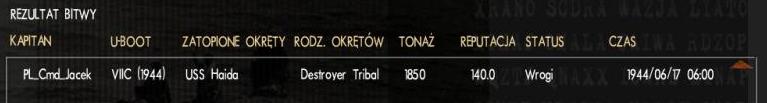 Zacząłem patrol z lekkim opóźnieniem (ok 15min), przychodzę więc, a tu Pablo i Sygula - KIA . Przeszukałem hydrofonem okolice, o jest konwój, zmieniłem kurs i wyszedłem na peryskopową. Jak tylko wysunąłem peryskop, zaraz zjawił się DD-ek i drugi i trzeci. Udało mi się je wyminąć, bez wykrycia, chociaż bomby wybuchały za rufą. Po jakimś czasie, znowu wysuwam peryskop i celuję w Ore Carrier, mam prędkość, kurs, odległość - ale ...... zaraz hałas za rufą, odwracam peryskop - DD kek. Zaraz potem impulsy ASDIC-a uderzają o pokład. Strzelam akustyka i zanurzam się. Bomby wszędzie, okręt uszkodzony i nie chce trzymać głębokości ciągle się zanurza. Dopiero szasowanie balastów pomogło.