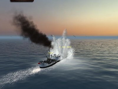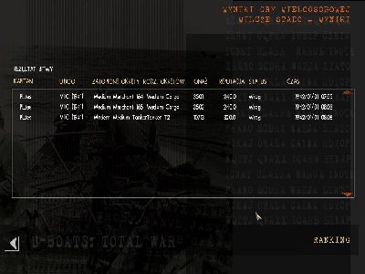 Zaczelismy pod woda. Kontakty na 330. Lewo na burt. Srednia na przod. Po 10 minutach pierwsze dymy. To grupa uderzeniowa. Omijamy pulapke Niestety inni mieli mniej szczescia. Jacek zszedl po 10 minutach a Imidar po kolejnych 15. Ominawszy pulapke spokojnie skierowalem sie na konwoj. Tym razem szczescie dopisalo. Samoloty odwiodly skrajengo lewego DD eskorty i bez problemow wszedlem do konwoju. Tam nastapila eksterminacja lewej flanki. Po kolei zeszly 2 srednie merchy i T2. Ostatni Merch dostal trafienie krytyczne, ale nawet "Crazy Finek" nie byl w stanie jego zatopic przed koncem patrolu.