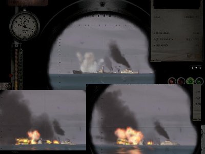 Kierując się na namiar z hydrofonu i meldunek o konwoju, natknąłem się na polujące niszczyciele, ominąłem je szerokim łukiem i wpłynąłem w konwój. Celując do tankowca, nie zauważyłem frachtowca, który uszkodził mi kiosk. Nie przeszkodziło mi to jednak wystrzelić torpedy w kierunku T3 - tankowiec zanurzył się lekko na rufę, ale płynął dalej. Kolejna torpeda trafiła pod pierwszym masztem - znowu bez efektu. Dopiero 3 spowodowała potężną eksplozję i zatonięcie.