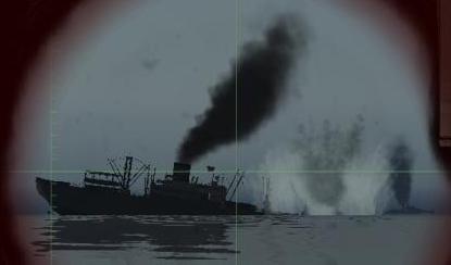 Najpierw poszedł na dno Garnville, który rozpadł się na kawałki w huku ogromnej eksplozji. Następnie na celowniku pojawił się Troop. 2 torpedy wystrzelone, ale co to 3 wybuchy ???? Pojawia się niszczyciel, więc kapitan obraca swego uboota rufą do nadpływającego nieprzyjaciela i strzela kolejną torpedę w mały frachtowiec - niecelną niestety. Skuteczne manewry okrętem pozwalają na wyjście ze strefy poszukiwawczej eskorty i na zajęcie dogodnej pozycji do ataku na C2 - 3 torpedy powalają przeciwnika na kolana. Kolejna torpeda leci w kierunku Liniowca, wybucha idealnie pod kilem topiąc go w ciągu najbliższych 2 minut. Na sam koniec zatrzymuje się trafiony w maszynownię średni handlowiec i po dokładce także tonie.