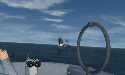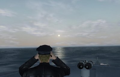 14:26 - Rufa frachtowca znika pod wodą. Widać 4 szalupy. Nie zbliżamy się do statku ze względu na bliskość wrogich jednostek. Oddalamy się od miejsca zatopienia na pełnej prędkości.
