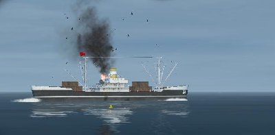 14:20 - Wystrzelono 12 pocisków z działa 88mm, trafiając 11 razy i X pocisków z działka 20mm. Frachtowiec nabiera przechyłu i płonie. Załoga spuszcza na wodę szalupy. Oddalamy się.