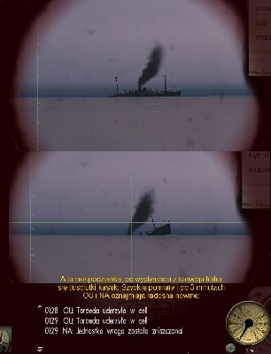 Pierwsze dwie torpedy strzelane do ore carriera tak aby byc może trafic DD Hunta który chodzil mi przed nosem i odgradzal od konwoju, gdy torpedy w wodzie to zwrot i ustawienie rufowe na frachtowca typu Granville. Słychac eksplozje i krzyk radosci co oznacza że torpeda trafila, ore carrier wybucha i tonie, potem Tes mi mówil że odnotowal dwa wybuchy bo akurat tez do tego celował, ale trudno dociec czy druga torpeda trafiła. Z rufowej strzal w granville i trafienie, ale nie widac specjalnie nawet podtopienia i cel odpływa, znowu zwrot dziobem do konwoju i próby dobicia Granville oraz atak na cargo steamera. Temu pierwszemu sie udaje, drugi rozlatuje sie po pierwszym trafieniu. Jeszcze jedna torpeda do Granville i znowu pudło, juz był pod złym kątem, zygzakowal i odl. 3km. Potem przeładowanie i atak na jakiegos ostatniego mercha w konwoju, bez rezultatu. Zostaje za konwojem, ale ku mojej radości oprócz węszących gdzies dwóch DD jest tu cos jeszcze: krązownik klasy kent. Najłatwiej ustawic sie z rufowej, strzelam i trafiam w dziób, on nabiera troche wody i przechyla sie na dziób a ja robie zwrot aby wystrzelic dwie ostatnie torpedy z dziobowych. Pierwsza nietrafia, jakies 2 minuty czekania na przeladowanie ostatniej i strzal, ale tym razem zapalnik magnetyczny wybucha w polowie drogi.