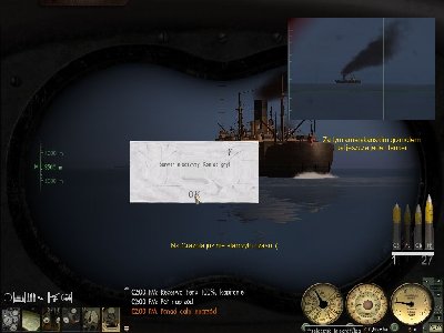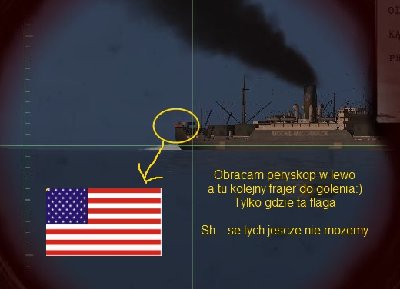 Po wyjsciu z konwoju los usmiecha sie po raz drugi. Ta sylwetka, skad ja ja znam, 2 maszty, hmm. Aaaa, no nie, to musi byc krazownik pomocniczy JKM. Pomiary, strzelamy 2 torpedy, obie w celu. Niemal w tym samym momencie NA obwieszcza zatopienie (skad on to wie dziad jeden). Radosc nie trwa dlugo, obrot peryskopem a tu z prawej nadplywa tanker i medium, bez eskorty ! Ale nam dzis szczescie sprzyja. Tankera pomijamy, maly siakis. Czekamy na medium. Chwila, chwila cos tu nie gra. Dlaczego na burtach jest flaga USA. Sh...se tego jeszcze nie mozemy. Potem probowalem sprzatnac z dziala tego malego ale juz byl daleko.