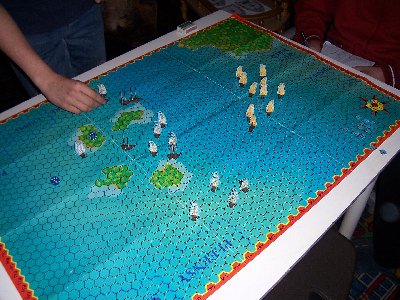 Na zdjęciu nie widać. Ale każdy okręt ma dość dokładną kartę, z działami, załogą, uszkodzeniami, ładunkiem, itd. I jak zacznie się bitwa... Zaczyna się komplikowanie.