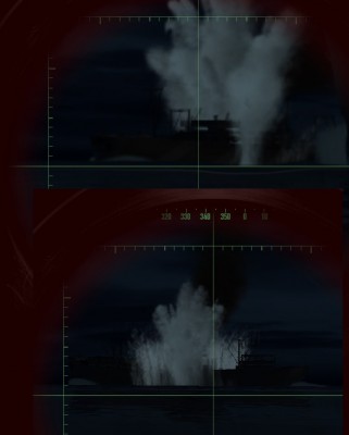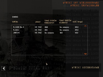 Po cichu wkradłem się do konwoju. Osiągnąłem całkiem niezłą celność do C3, ale dziad zwiał... Przeładowałem torpedy i zaatakowałem na raz dwa troop transporty. Myślałem, że 1 spudłuję, gdy trafiłem 2 cele i zaczęło się piekło... Przedni poszedł na dno, ale prawie staranował mnie merch... Mój peryskop zauważył "dziwny DD" z amerykańska flagą i zaczął do mnie strzelać. Gdy peryskop znikał pod wodą zobaczyłem drugi cel... Ale tak niewyraźnie, że nie zauważyłem, ze to nie ten cel... Bo ktoś wszedł mi na drogę! Uciekłem na głębinę, nie wiedząc, że te belki z bombami, to katapulty wodnosamolotów krążownika Brooklyn. Niemniej DD przybyły i długo i skutecznie okładały mnie bombami... Po 30 minutach zrezygnowałem z podejmowanej próby wyjścia i dobicia celu (który nieszczęśliwie stanął). Zginął Janko, chwilę potem Mirko. Z ustaleń wynika, że Janko uszkodził Pancernik, a Mirko coś jeszcze napsuł Trooposzom.. Przeżyłem patrol, aby dowiedzieć się, że zamiast Troopa trafiłem w zachodzący go T2...