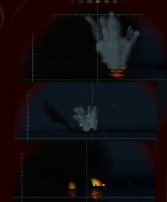 3:15 - T2 do T3 Trafiony. Mirko atakuje cel za tankowcem. Krążownik pomocniczy