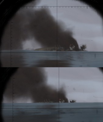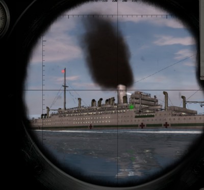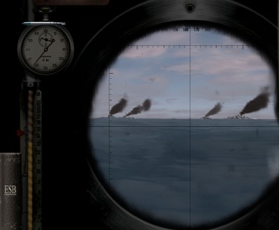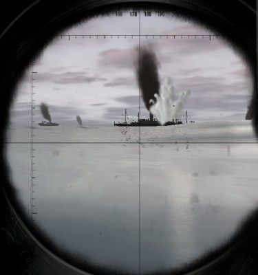 Jednak przepływający w pobliżu trawler wykrył peryskop Finka i go ostrzelał (co widać na obrazku). Ale to tylko gra, trawler nie zawrócił, aby zaatakować wykryty cel, nie ściągnął DD'eki w to miejsce.