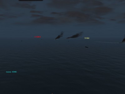 Po wyjściu na "peryskopową", strzelam 2 torpedy do dużego Ore - obie celne, ale statek nie tonie. W chwilę potem oświetlony jak choinka statek „przytula” się, mocno kołysze okrętem. Znowu problemu z utrzymaniem głębokości. Zanim załoga „wytrymowała” okręt, byłem już prawie za konwojem. Odpalam 2 torpedy do przepływającego w bliskiej odległości OPL. Trafiony, po kilku(nastu?) minutach tonie – jedyny łup tego patrolu.