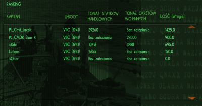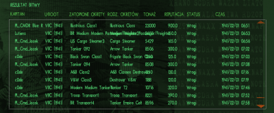 Potem miałem problem. Ktoś był szukany między mną, a konwojem... I raz nawet niszczyciel, co kręcił się, wykrył mnie i zmusił do ucieczki w głębinę. Z tego powodu musiałem strzelać z daleka i osiągnąłem 2 trafienia, ale oba okręty odpłynęły. Pod koniec gry wystrzeliłem ostatnią torpedę do unieruchomionego celu, chcąc pomóc (jak okazało się, Jacek dwukrotnie sobie już pomógł), ale torpeda odbiła się od celu.