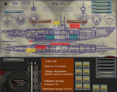 -Jeden niszczyciel śledzony przez hydro, innych brak, 3 martwych, zniszczona obudowa kiosku, rozładowane baterie, niesprawny prawy elektryk, lewy diesel wygląda obecnie gorzej, niż przed naprawą.