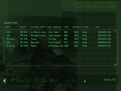 7 niszczycieli w odległości 200 metrów ode mnie, ja na peryskopowej, peryskop wystawiony, wolno płynę, nie mogą mnie namierzyć. W końcu jednemu się udało coś zrzucić i uszkodził mi kiosk, działo i rufę. Reszta patrolu to rozstrzyganie czy rankingowy czy nie.