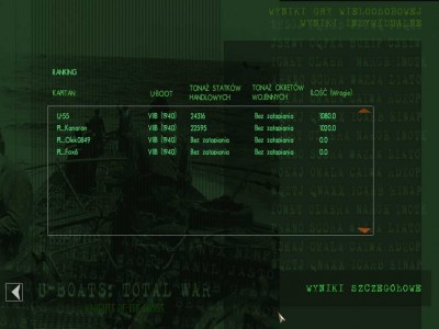 5 minut później się wynurzam i pędzę dalej w stronę namiaru Po chwili przepłynięciu 6-7 Km peryskopowa i sprawdzam hydrofonem gdzie są ale prócz konwoju nie mam nic ciekawego więc zawracam mój OW mnie straszy widzi coś z 13000m w tej mglę. No dobrze w kierunku konwoju po 20 minutach wreszcie pierwszy kontakt niszczyciel mnie zagania pod wodę ale zaraz się wynurzam bo się trochę oddalił i ledwo go widać przez mgłę I cała naprzód w stronę gdzie słyszałem konwój za chwile drugi Niszczyciel tylko dziwny bo z 3 kominami Pytam się czy ktoś zna taką jednostkę ale nikt Więc lecę Amerykanin nie Brytol nie Kanadyjczyk nie Polak Tak Borruasuque przymierzam do strzału dane wyglądają na dobre ale nie trafiam a po kilwaterze dociera do mnie jak po nitce. Za późno się zorientowałem i mnie staranował 47% integrałki ale cisza ani pinga ni nic więc cały czas na peryskopie i na całej na przód za chwila Ping i szum wody "Co do cholery znowu ?" Obracam peryskop Niszczyciel świetnie Alarmm!!! Za wolno 2 przedziały dziobowe na czerwono zaraz potem do Obserwatora