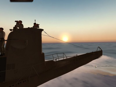 Po kursach nawigacji poznaliśmy od Olka przybliżoną pozycję konwoju. Po 40 minutach patrolu na horyzoncie pojawił się pojedynczy dym. No to maszyny stop, podaje pozycję konwoju i zanurzenie. Oczywiście piękna wyporność kaczki spowodowała, że się wynurzyłem... Udało mi się wytrymować na 13 metrach.