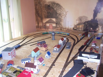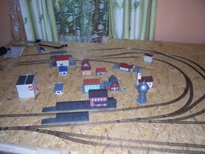 Zrzutka 12 lipca 2013 019.JPG Pierwsza próba rozstawienia modeli budynków... Chyba dworce zamienię miejscami.... Aha, te "krzyżujące się" tory, to będzie most. Tylko jeszcze górek nie ma