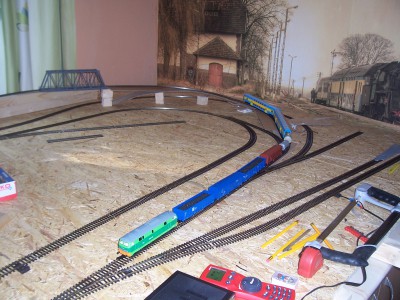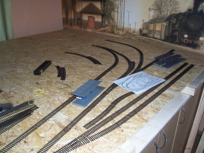 W zasadzie to powstał na zamówienie. Kupuję kolejkę w małym sklepie i z właścicielem mailuję. Podałem mu wymiary, on zaproponował kształt, ja poprawki i w zasadzie na podstawie jego pomysłu i kilku moich poprawek powstał ten kształt, potem zakupiłem (od niego oczywiście) tory, zasilanie, sterowanie i inne elementy. Dokupiłem też kilka innych pociągów i dziś będę (dostałem dokładny schemat torów z rozbiciem, który dokładnie tor gdzie. Jakoś albo ja nie zauważyłem w pudle w z papierami wypychającymi wnętrze wywaliłem, albo zapomnieli spakować.) układał gotowy kształt, szykował podjazdy i robił testową jazdę.