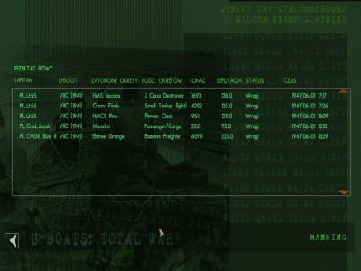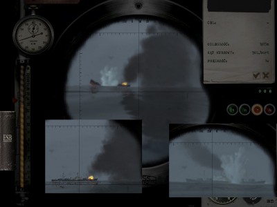 Na 2 minuty przed końcem patrolu, wykryto mnie i ... pomyliłem klawisze, zamiast zanurzenia, wcisnąłem wynurzenie a następnie szasowanie balastów . Pięknie wyskoczyłem na powierzchnie prosto pod lufy niszczyciela. Był tak zaskoczony, że tylko parę pocisków mnie trafiło i zdążyłem się zanurzyć. Uff Koniec patrolu.