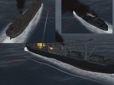 Po dłuższej chwili wynurzyłem się i ruszyłem na powierzchni. Udało się dojść do frachtowców i zaatakowałem. Pierwszy handlowiec eksplodował. No to zająłem się Fastem. 8 torped (w tym dwa pudła) i nic. Zapalił się i tyle, odpłynął w siną dal. .
