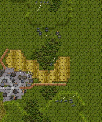 Gdy Leopardy plutonu Feldfebel Bonny kolejno mijały czołg Wunscha, Yannik oczekiwał na czołg Bonny. Ten poruszał się jako ostatni. Ledwo Wunsch ruszył jej tropem, gdy z północy odezwały się eksplozje. Wunsch obejrzał się za siebie i dostrzegł zza lasu dym, jakby od eksplozji... Wtem jego pole widzenia przecięła rakieta... lecąca od miasteczka, na wschód. Szybki rzut oka na miasteczko, ukazał działa plutonu Bormana oraz oddział piechoty z wyrzutnią PPK, zajmujący pozycje na skraju miasteczka, który otworzył ogień...