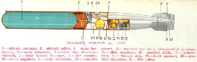 Przedział silnika i przyrządów sterowania - dzieli się na 2 części. Pierwsza z nich jest nieszczelna i zawiera czterocylindrowy silnik napędowy, regulator ciśnienia powietrza, podgrzewacz, przyrząd zanurzenia i maszynkę sterową sterów poziomych. W drugiej części znajduje się żyroskop wraz z reduktorem ciśnienia, maszynką napędową i główny wał napędowy.