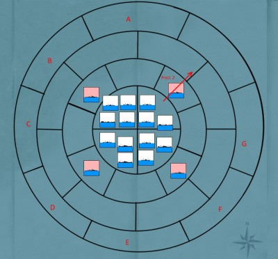 Zająć pozycję wokół konwoju do nocnego ataku (litery A-G. Pozycja przed konwojem dostępna tylko podczas ataku, ze względu na manewrowanie konwoju)