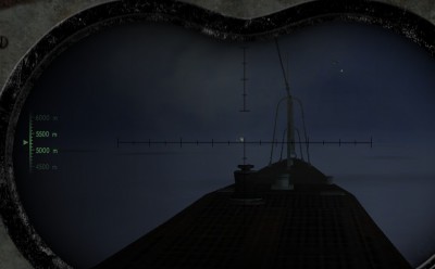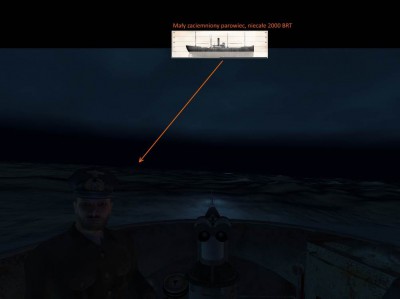 Wygląda na duży cel. Przygotujmy atak torpedowy po zmroku. Atak z powierzchni, duza odległość, 4 torpedy do transportowca. Zaraz po wystrzeleniu torped zwrot na oddalenie i w zanurzenie.