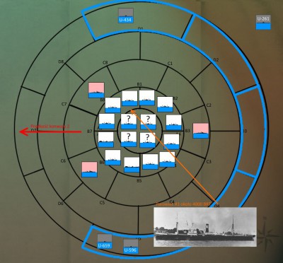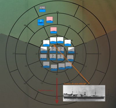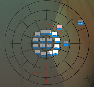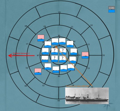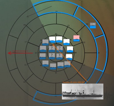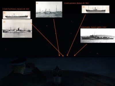 Już o 23:15 Muller podejrzewał, że coś jest nie tak. Konwoju, jak nie było widać, tak nie było wciąż widać. Wreszcie wachtowy dostrzegł ciemny kształt konwoju, złożony z cienkich sylwetek. Konwój oddalał się. Za to podporucznik nagle dostrzegł na prawej burcie niszczyciel, który zataczając koła najwyraźniej szykował się do ataku na zanurzony okręt (na nowym C8, bo twoje C8, przy kursie starym wypada na D obecnie)