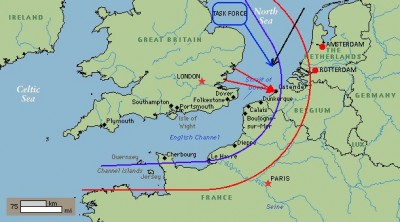 -Sir. Kluczem operacji jest udział lotnictwa. Niestety, zarówno Amsterdam, jak i Rotterdam leżą zbyt daleko od naszych baz. Maksymalny zasięg w którym nasze myśliwce mogą wciągnąć wroga w walkę na równych zasadach, to czerwony okrąg, ale preferowany obszar, to niebieski okrąg, gdzie walka odbędzie się na naszych zasadach.... Jak pan widzi pozostał obszar od Hawru, aż do Ostendy. Cieśnina Dover jest skutecznie umocniona, podobnie jak Hawr. Z miejsc, które są słabiej umocnione pozostało Dieppe, Dunkierka oraz Ostenda. Admirał Mountbatten planował uderzenie na Dieppe, ale ponieważ nasza część wymaga dostępu z Morza Północnego zaproponowano jako rozwiązanie zastępcze uderzenie na Ostendę lub Dunkierkę. Obie propozycje były rozważane i zdecydowano na atak na Ostendę.