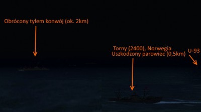 Nagle eksplozja poderwała najmniejszy z parowców, który zatrząsł się niczym zabawka. Trafienie w okolicach kotłowni nie mogło skończyć się dla takiego statku niczym dobrym. Chwilę później w niebo poszybowały flary, a jedna z torped trafiła w rufę większego parowca, powodując niezwykle słabą eksplozję. A może tylko na taką wyglądała, gdy płatki śniegu rozświetliły ocean i wystający z wody kiosk U-93.
